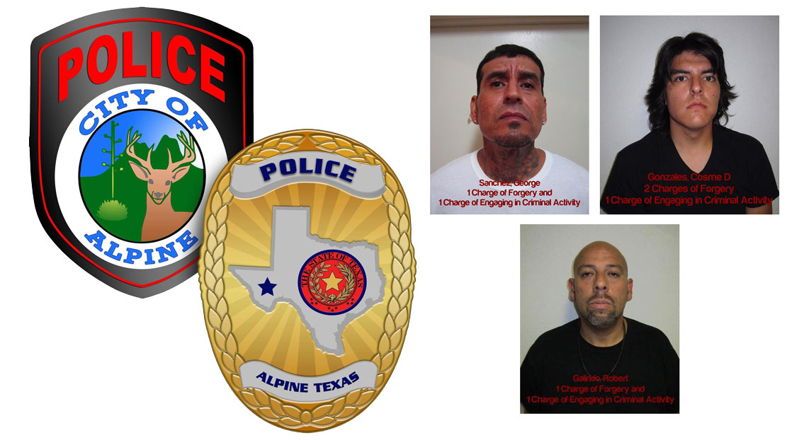 Alpine PD detained Robert Galindo, Cosme Gonzales, and George Sanchez. Gonzales is charged with with two counts of forgery and one count of engaging in criminal activity. Gallindo and Sanchez were both charged with one count of forgery and one count of engaging in criminal activity.