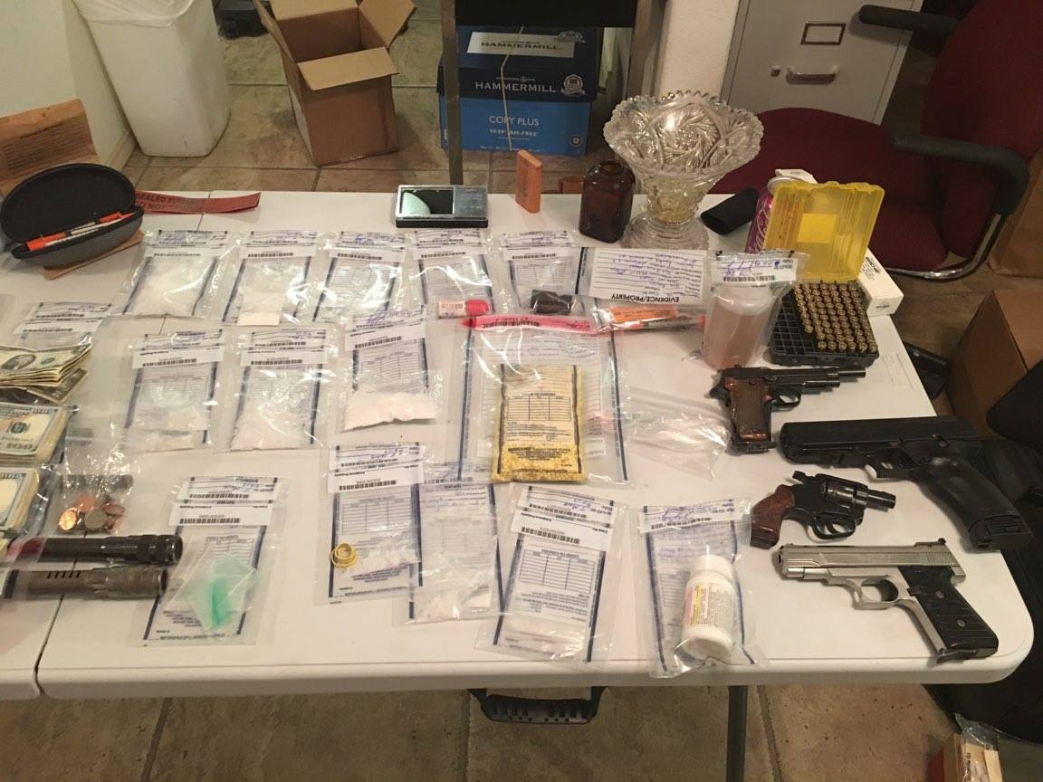 During the warrant searches, officers seized over 16 pounds of Methamphetamine, multiple scales, packaging materials and drug paraphernalia. Officers also located several firearms, some of which were confirmed as stolen.