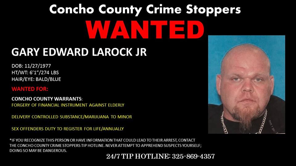 CONCHO COUNTY, TX-- Gary Edward Larock Jr., 39, is wanted in Concho County on three separate charges, according to a Concho County Sheriff's Office post on Facebook.