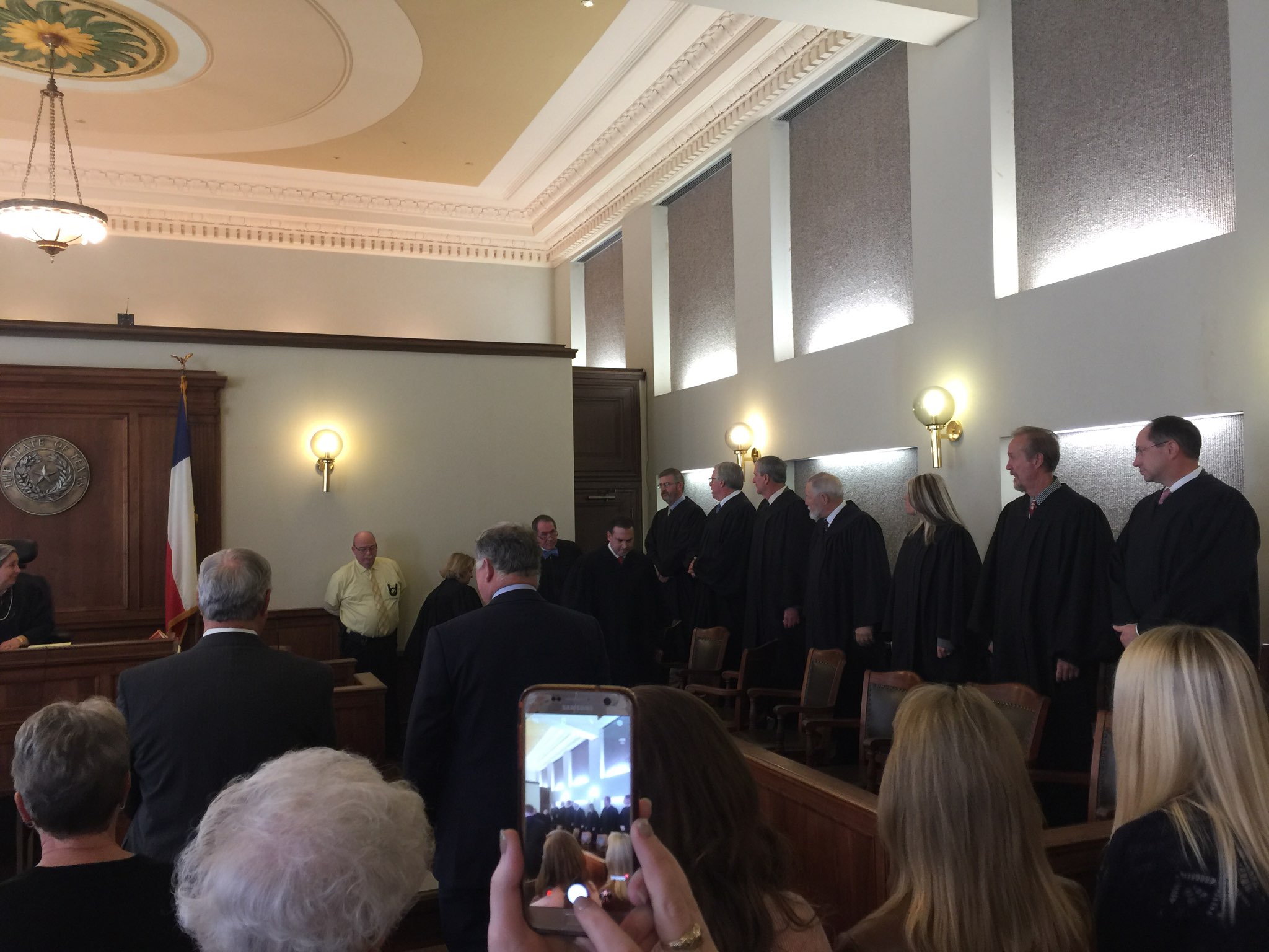 District Judges Ben Woodward, Jay Weatherby, and Brad Goodwin were joined by County Court-at-Law Judge Ben Nolen, Justices of the Peace Susan Werner and Eddie Howard and County Judge Steve Floyd to witness the ceremony.
