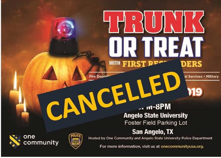 According to the San Angelo Police Department, Due to weather conditions, tonight’s Trunk or Treat with First Responders event has been canceled.