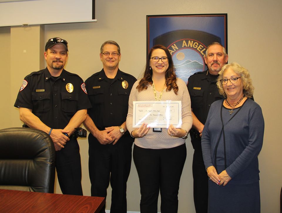 According to the SAPD, Yesterday afternoon, San Angelo Police Chief Frank Carter and Assistant Chiefs Tracy Fincher and David Howard received a $1K donation from the All Veterans Council of Tom Green County for the purchase of a new Police Service Dog.