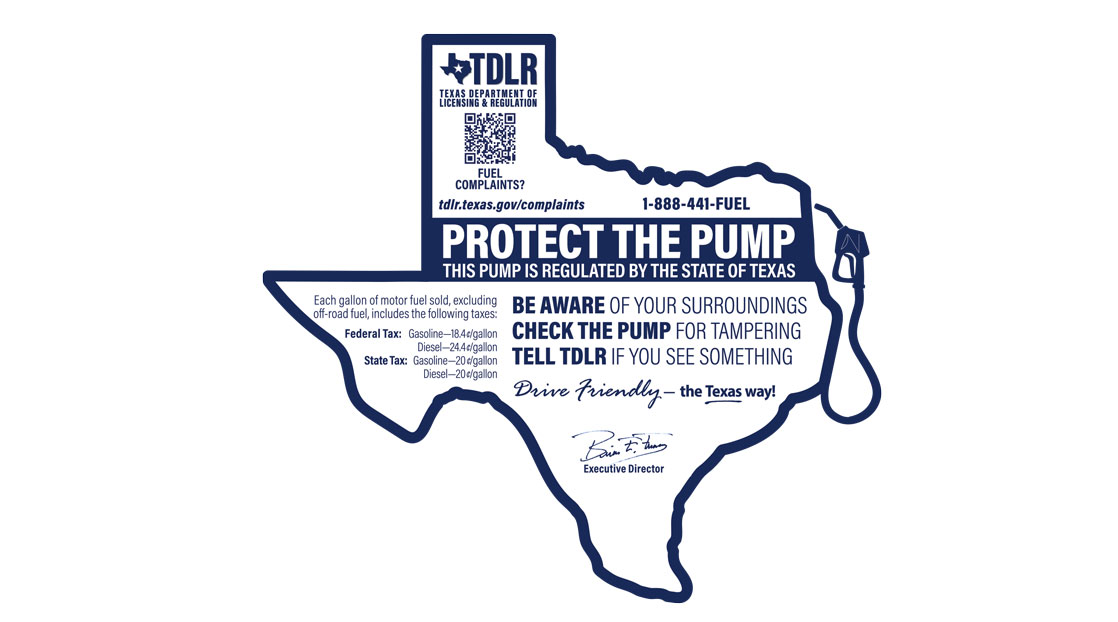 The new design has a Texas shape and includes information about the amount of state and federal taxes charged for every gallon of fuel sold, as well as a telephone number and a QR code that consumers can use to file a complaint with TDLR regarding the quality or quantity of fuel that was sold. Consumers can also use the contact information to report possible credit card skimmer activity to TDLR.