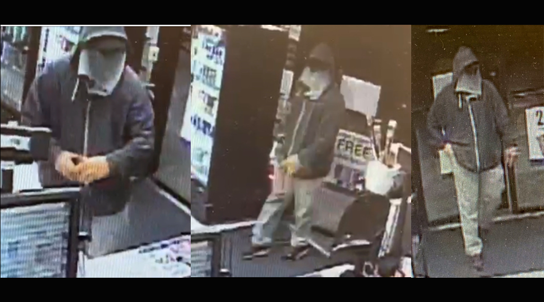 The suspect is identified as being possibly Hispanic male with brown eyes. At the time of the incident, his face was covered with gray cloth and was wearing a dark gray hoodie, black hat, light-colored pants, and orange gloves.