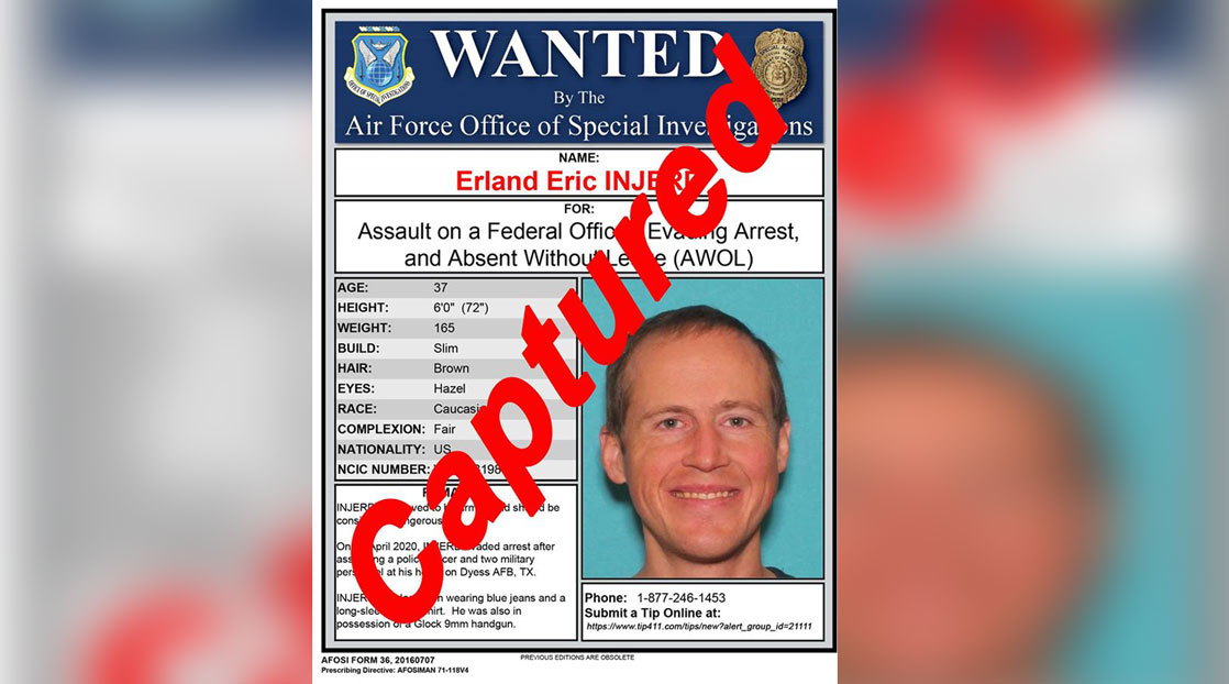 Now the the Air Force Office of Special Investigations tells KTXS, Airman First Class Erland Injerd was successfully taken into custody Wednesday after avoiding capture for over two weeks.