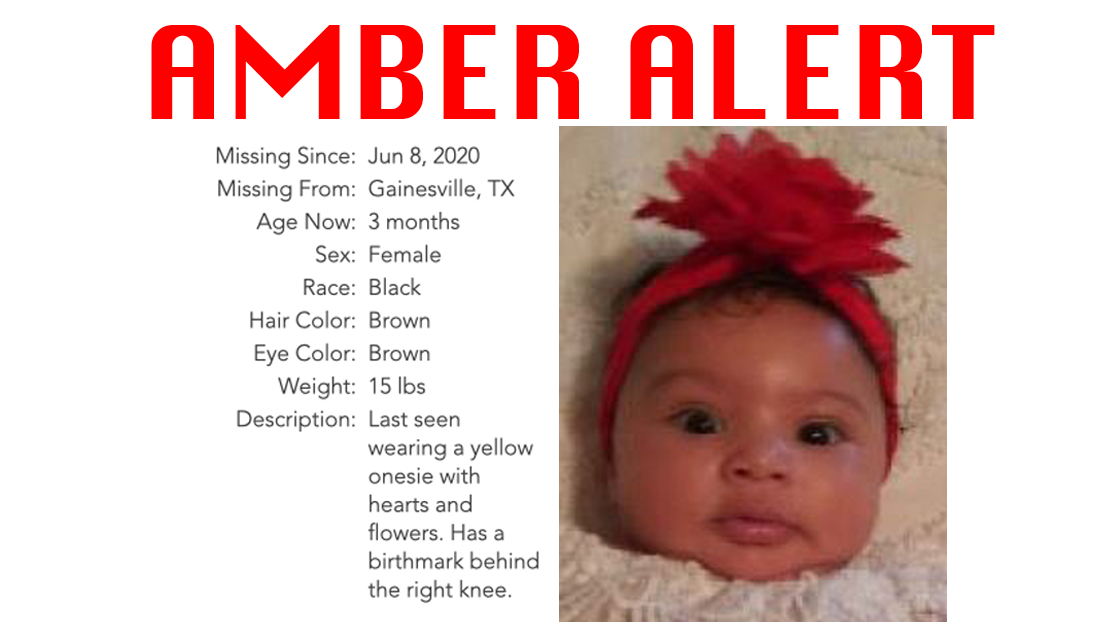 GAINESVILLE, TX — An AMBER Alert has been issued for 3-month-old Lyrik Aliyana Brown who was last seen Monday night in Gainesville.
