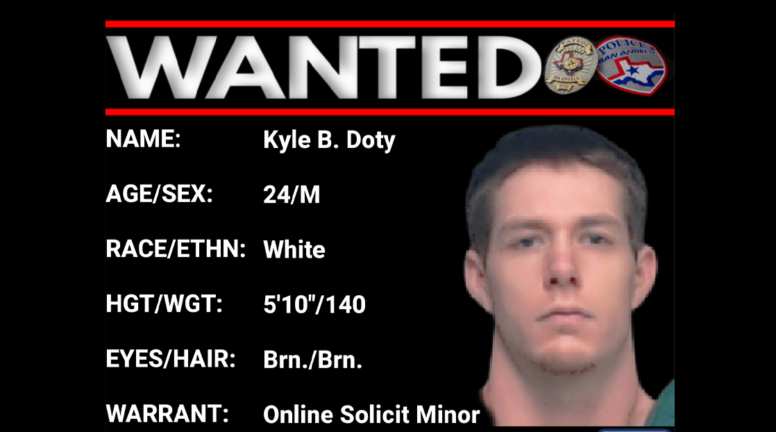 SAN ANGELO, TX — San Angelo Police are once again searching for 24-year-old Kyle Doty for online solicitation of a minor.