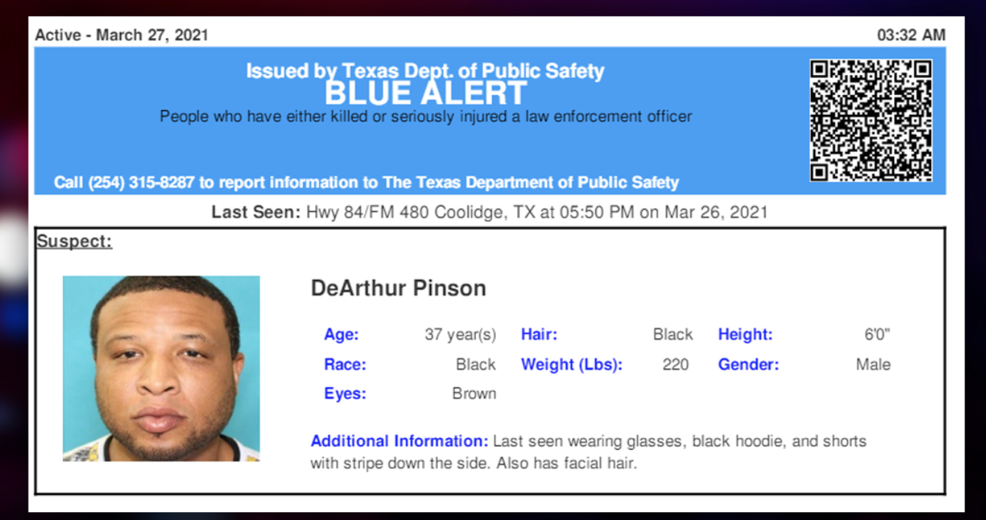 AUSTIN, TX – The Texas Department of Public Safety has issued a blue alert for an armed and dangerous suspect wanted in connection with the shooting of a trooper in Mexia, TX.