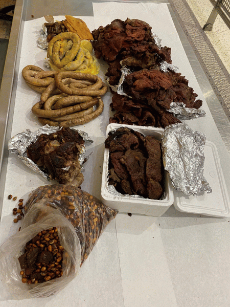 With this declaration, the female passenger was referred for a baggage examination where CBP agriculture specialists discovered four pounds of chicken and beef sausages, four pounds of pork skins, 11 pounds of beef, four pounds of pork and citrus leaves concealed in roasted corn.
