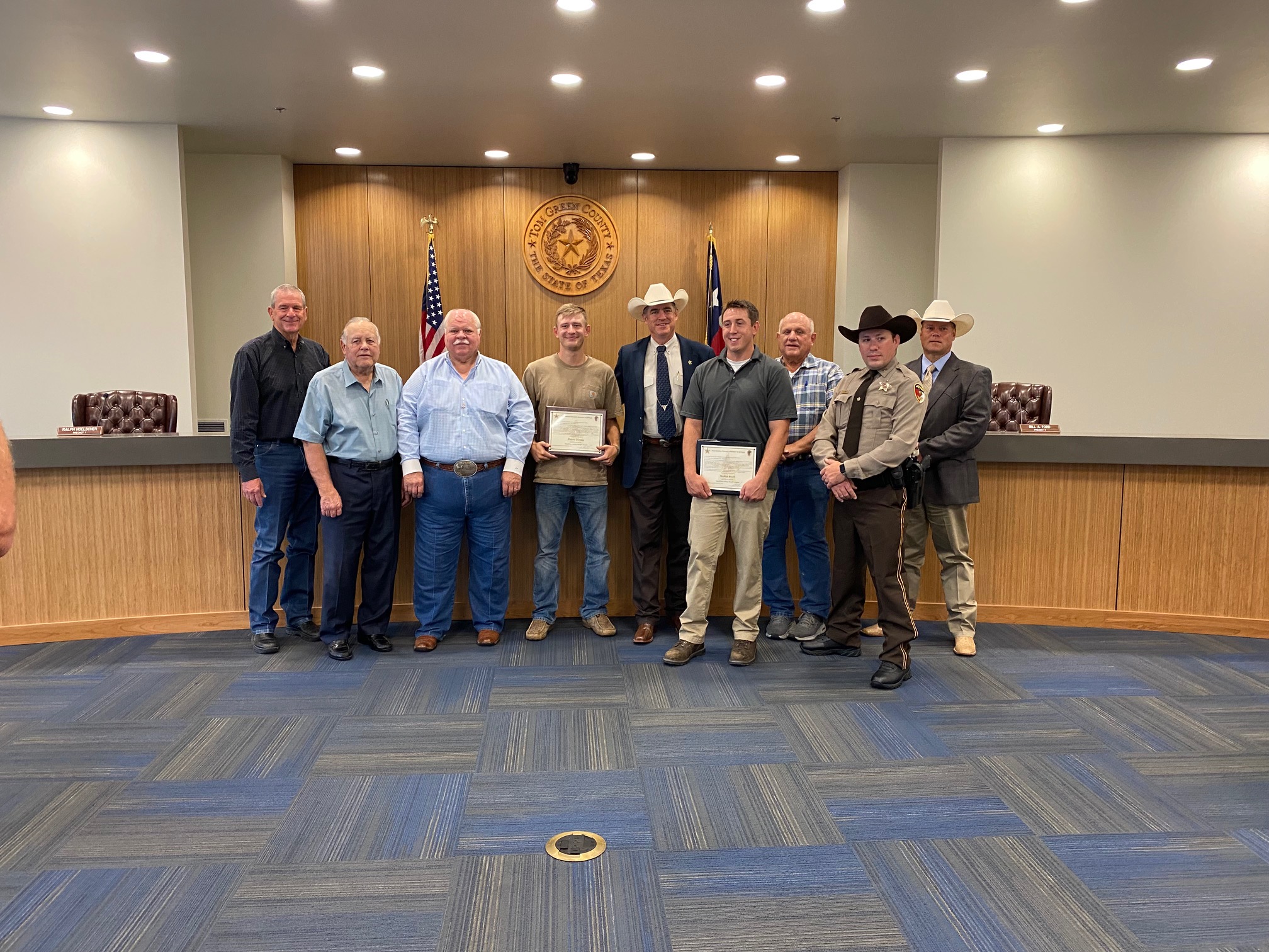 SAN ANGELO, TX – The Tom Green County Commissioners Court joined Sheriff Nick Hanna Tuesday morning and a full house of law enforcement officers to honor two men who helped an injured deputy subdue a fleeing suspect.