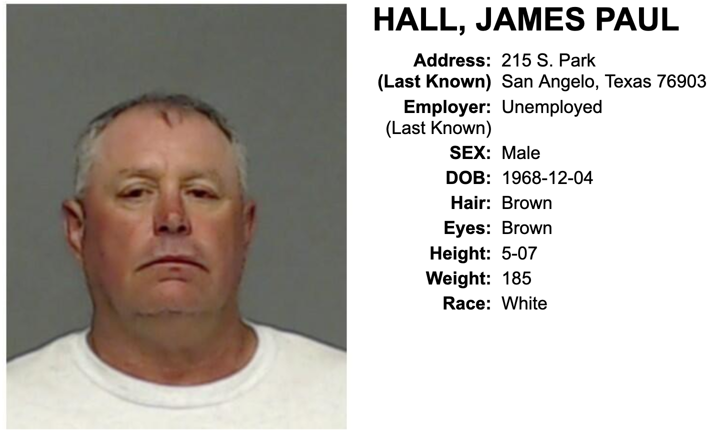 Anyone with information on the whereabouts of James Paul Hall should call the Tom Green County Sheriff's Office at 325-655-8111.