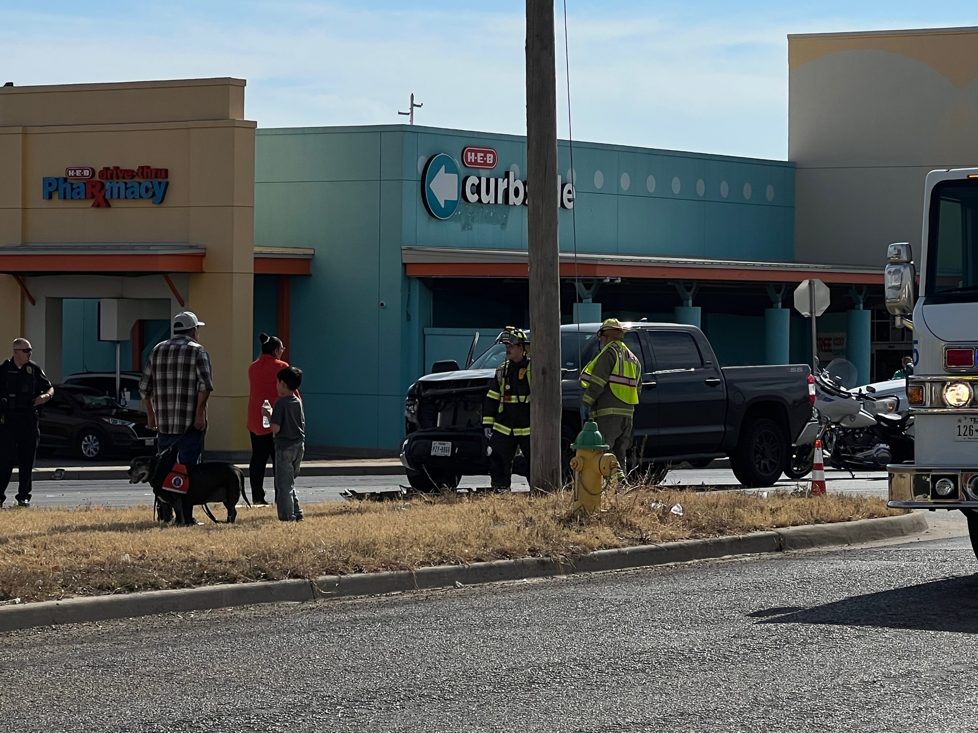 SAN ANGELO – One driver was injured and a child and dog survived a two pickup crash in San Angelo Thursday afternoon in front of the old H-E-B on Ave. N.