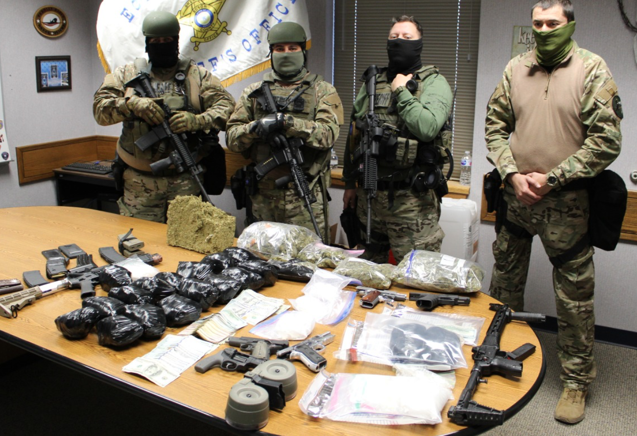 The warrant yielded 24 pounds of methamphetamine, five pounds of marijuana, a half a kilo of cocaine, two rifles, five handguns, and around $8,000 in cash. The drugs have been set to a lab for testing.