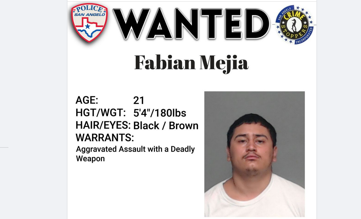 On this weeks "Wanted Wednesday" the San Angelo Police Department is searching for a San Angelo Resident named Fabian Mejia. Fabian currently holds an active warrant for Aggravated Assault with a Deadly Weapon and they would like to take him into custody as quickly as possible.