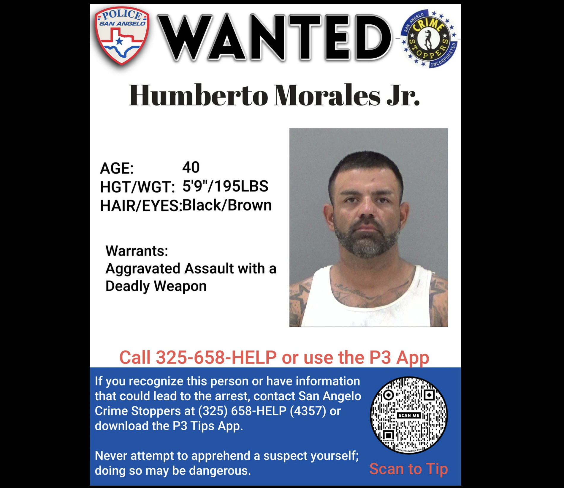 The San Angelo Police Department is offering $1,000 for information that leads to Morales Jr. arrest. If you recognize this person or have information that could lead to the arrest, contact San Angelo Crimes Stoppers at (325) 658-4357 or download the P3 app on your phone.