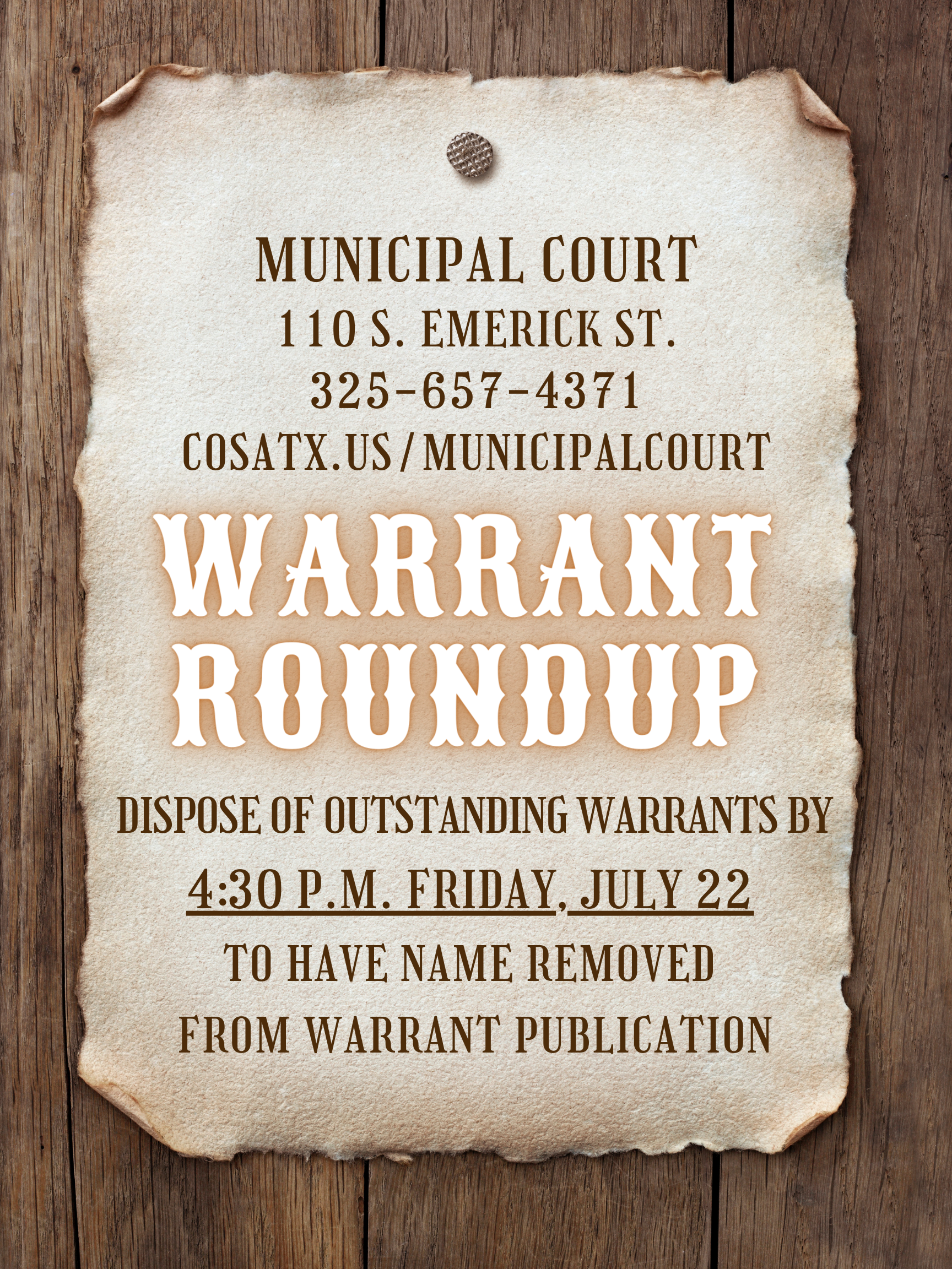 To resolve outstanding warrants, it is required to appear in person at the Municipal Court, 110 S. Emerick St. The office is open Monday through Friday, 8 a.m. to 4:30 p.m. Please call the Municipal Court office at 325-657-4371 for alternative options to further assist in resolving a case.