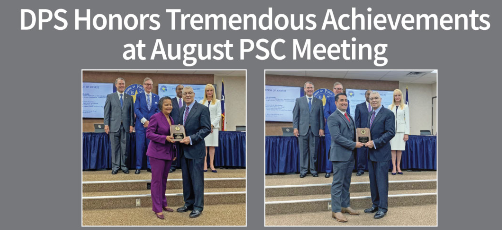 AUSTIN – The Texas Public Safety Commission along with Texas Department of Public Safety Director Steven McCraw presented two Adolph Thomas Distinguished Service Awards, four Lifesaving Awards and a Unit Citation to department personnel at the PSC meeting on Thursday, Aug. 25, at DPS Headquarters in Austin. Two Director’s Awards were presented to partner agency members at the meeting and additional department personnel were recognized for awards recently received from outside the agency.