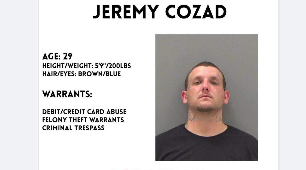 According to the SAPD, Jeremy Cozad has warrants for Debit/Credit Card Abuse, Felony Theft, and Criminal Trespass.