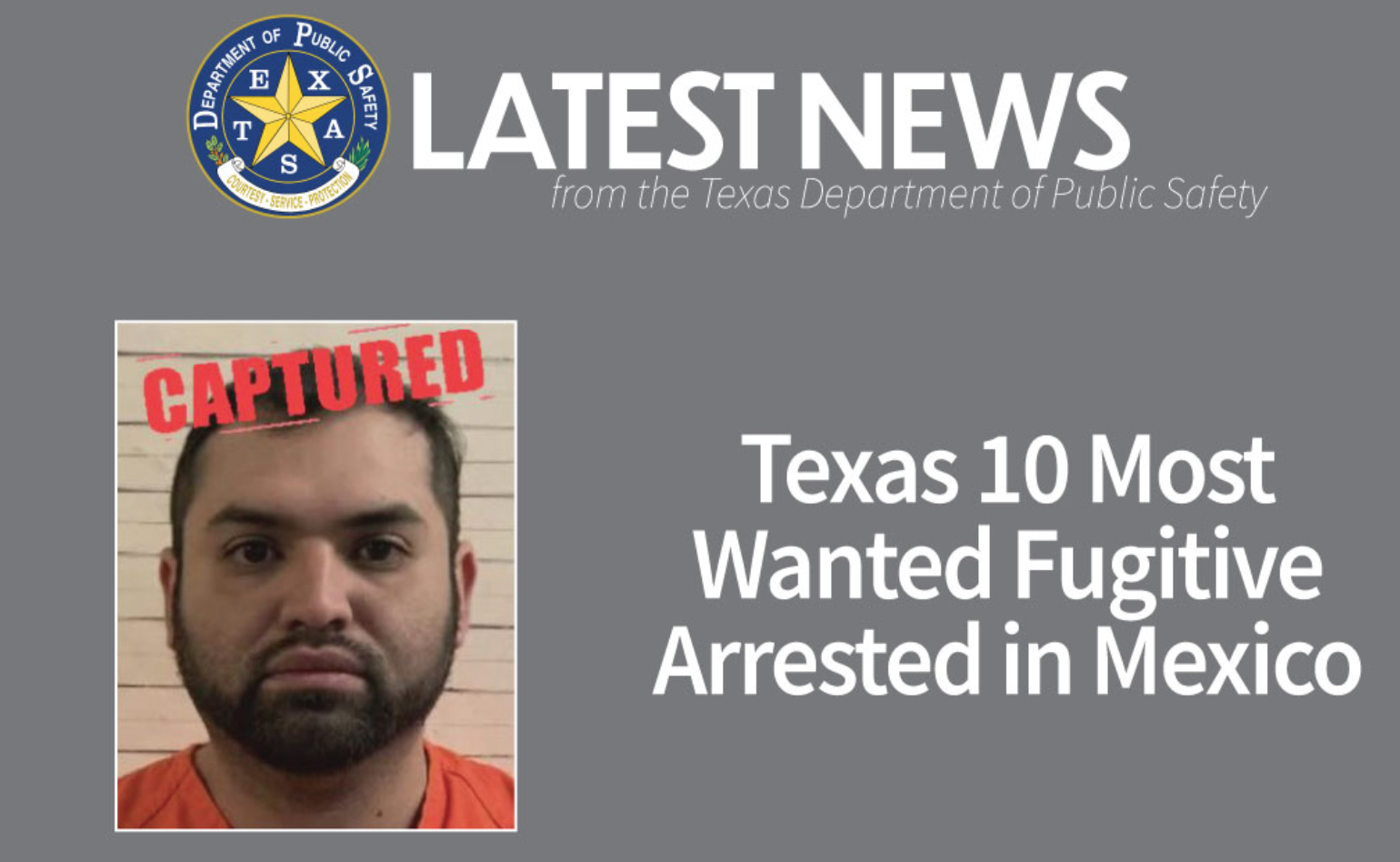 Jose Manuel Hernandez, 31, was arrested and then brought to the Juarez-Lincoln Port of Entry in Laredo, Texas, by Mexican Federal authorities. He was then taken into U.S. custody by members of the U.S. Marshals Gulf Coast Violent Offenders Fugitive Task Force, including DPS Special Agents. The Pecos Police Department and members of the U.S. Marshals Lone Star Fugitive Task Force, including DPS Special Agents, assisted in the multi-agency investigation.