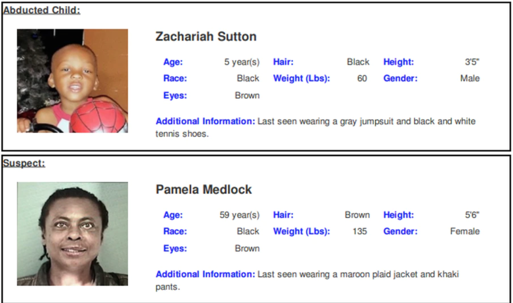 Zachariah Sutton is a black male and was last wearing a gray jumpsuit and black and white tennis shoes. The suspect is 59-year-old Pamela Medlock and they were last spotted in a green Jeep Wrangler.