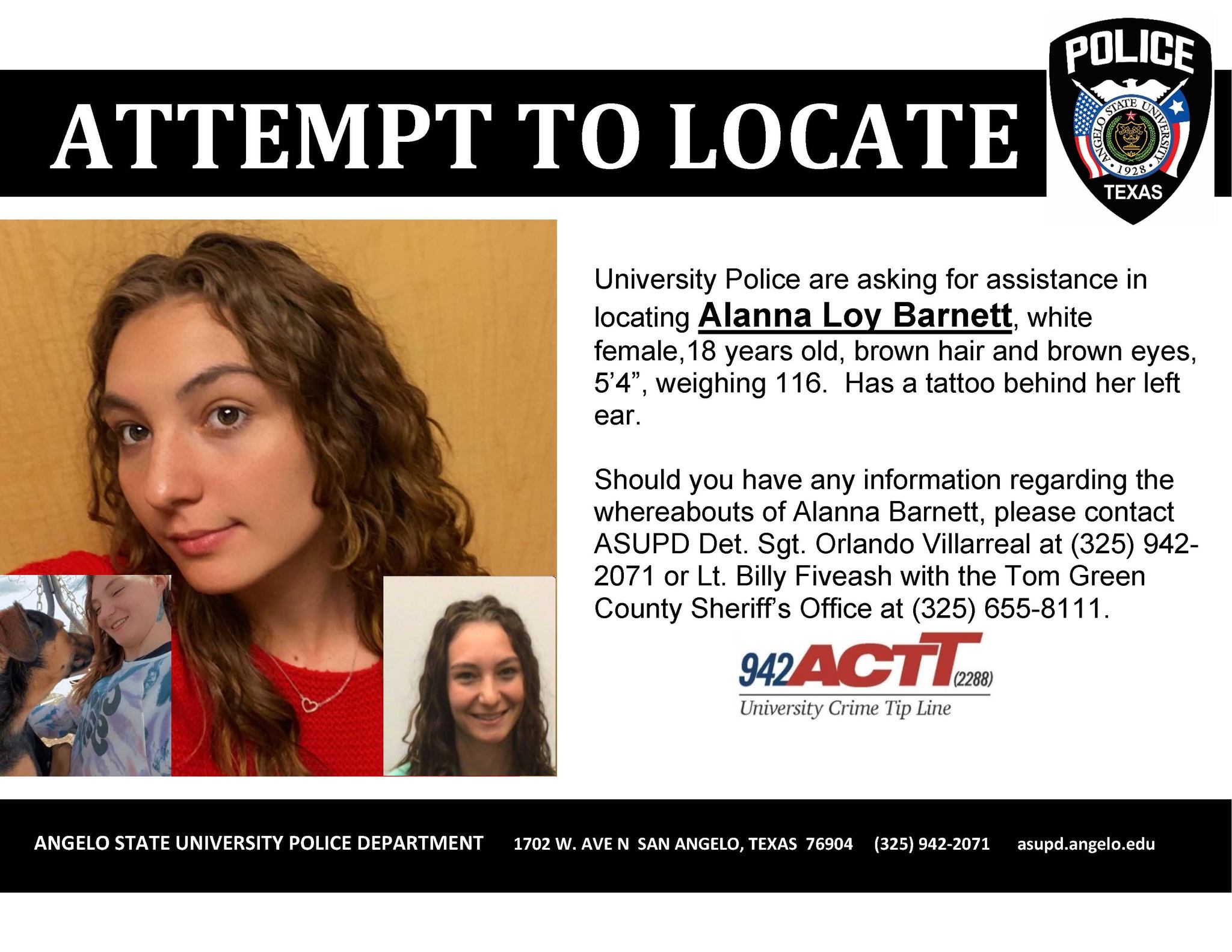 If you have seen her or have any information, call the ASUPD at 325-942-2071 or the Tom Green County Sheriff's Office at 325-655-8111.