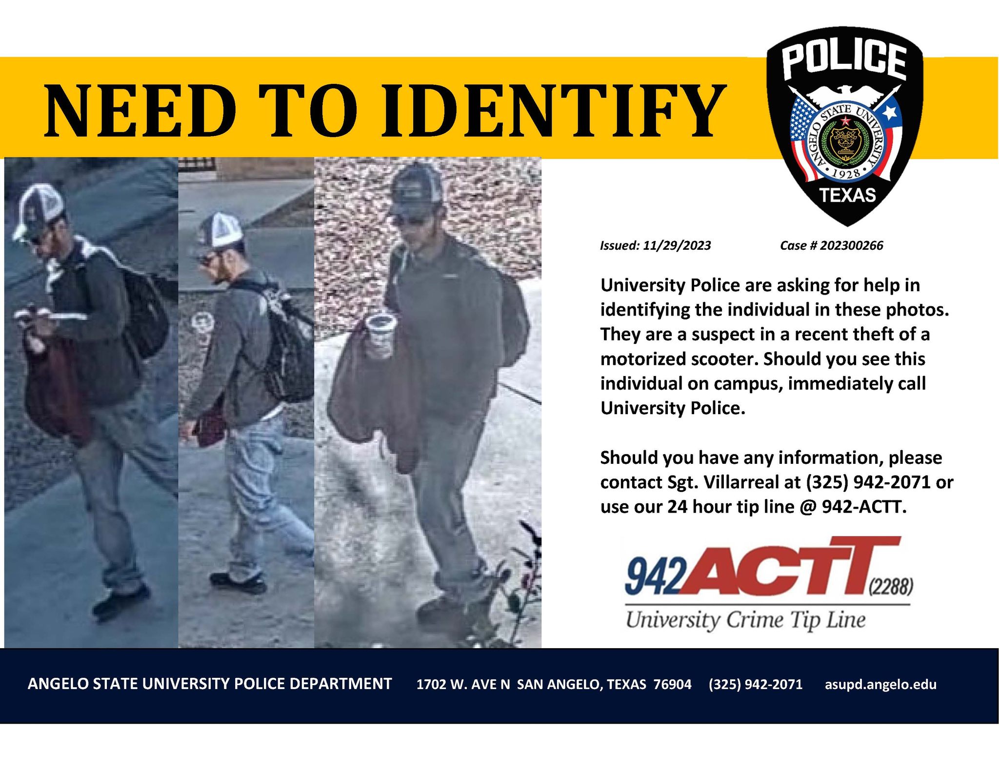 SAN ANGELO - Angelo State University needs help identifying a suspect involved in a recent theft of a motorized scooter.