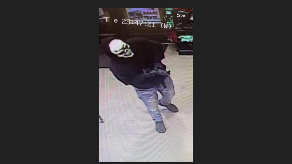 An examination of store surveillance footage during the subsequent investigation revealed that the suspect initially entered the store wearing a dark-colored hooded long-sleeve shirt or lightweight jacket, a ball cap, blue jeans, and gloves while carrying a duffel bag.