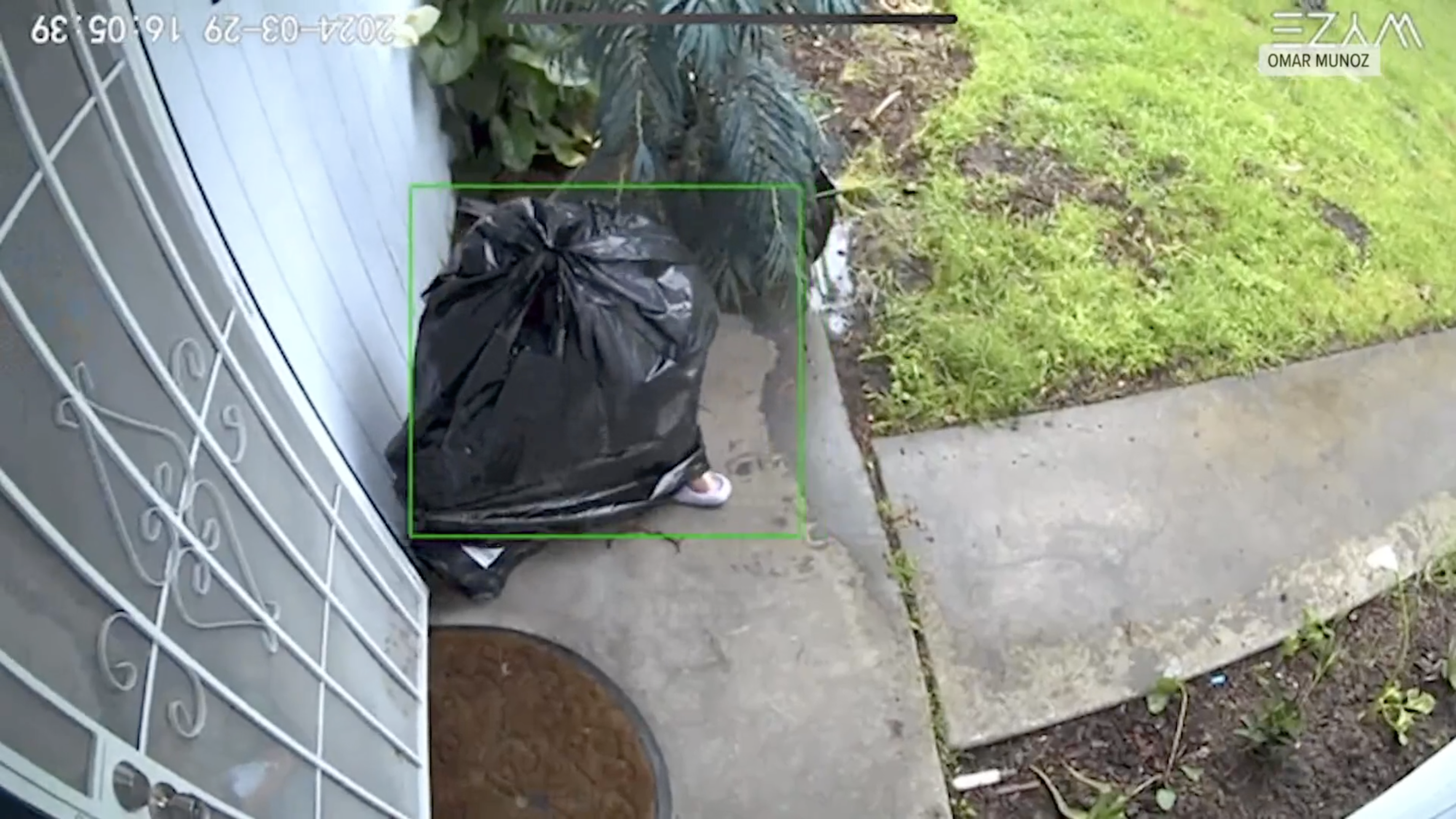 Video shows a person crouched inside a trash bag, slowly waddling to the homeowner's doorstep, picking up a small package, and waddling away.
