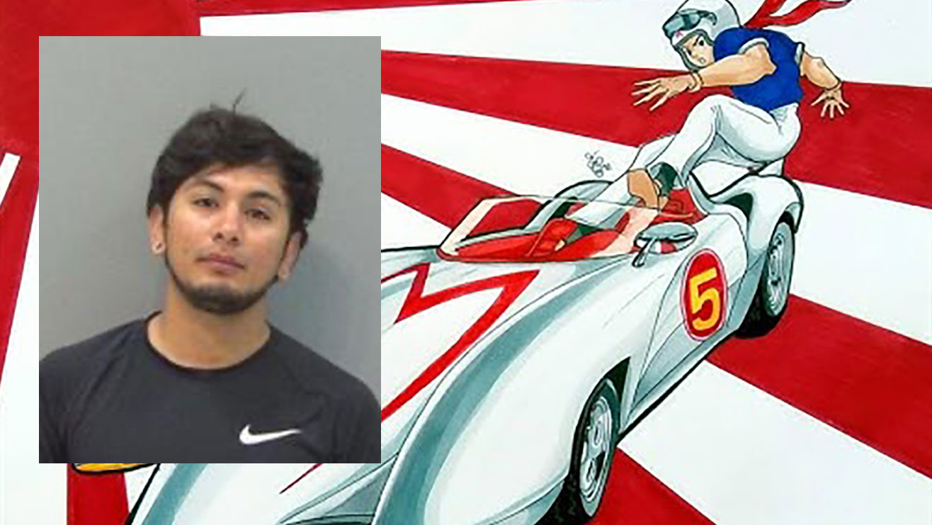 Speed Racer, also known as Jaime Almaguer, 25, was arrested for racing on a highway by the San Angelo police and booked into the jail at 6:31 a.m. yesterday morning. He was released on a $500 bond at 1:13 p.m. We have no idea with whom he was racing because no one else was arrested for that charge.