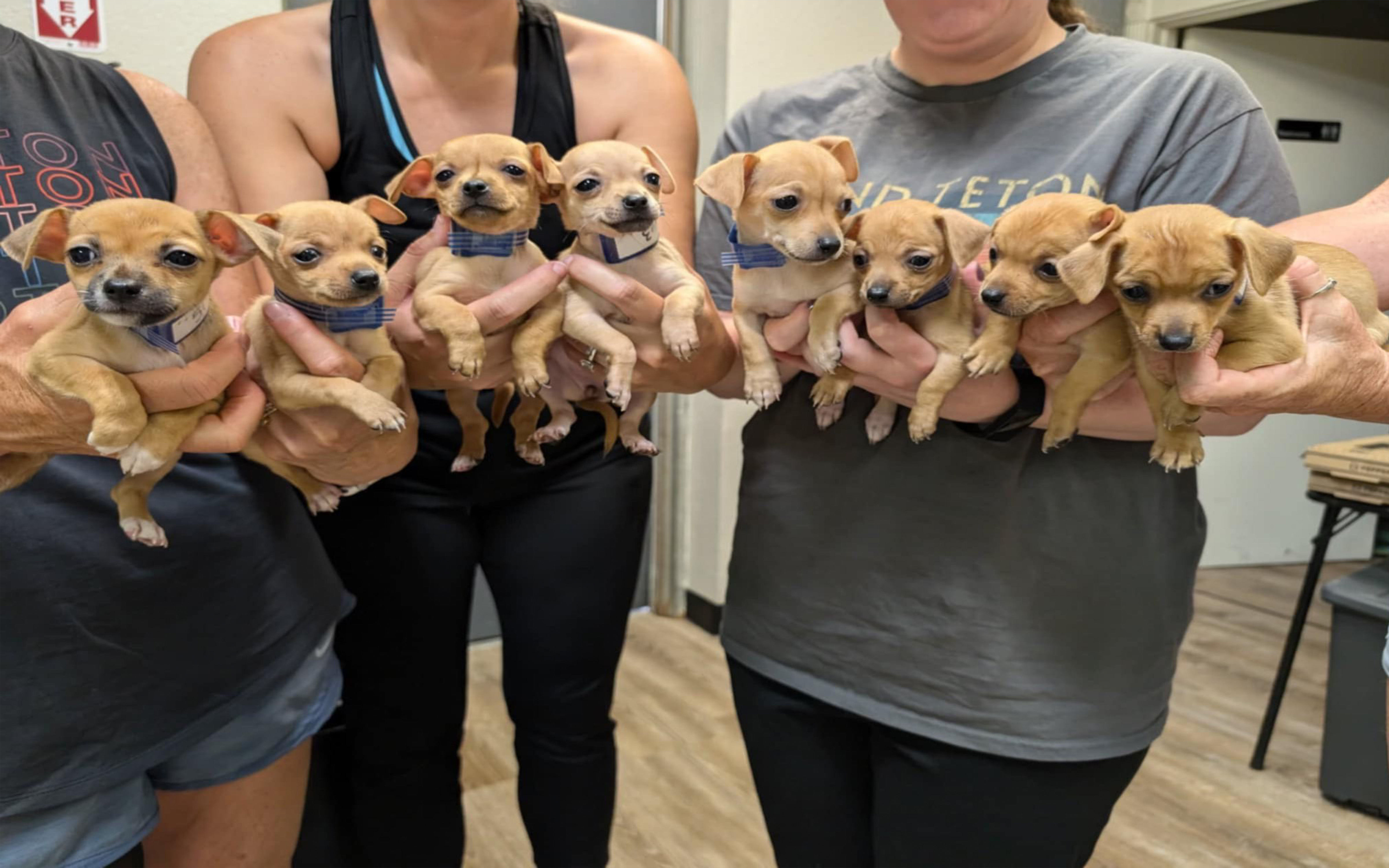 The puppies, described as Chihuahua mixes and only five weeks old, were reported to be found by a good samaritan at Casa Bella Park and are now in the care of rescue organizations.