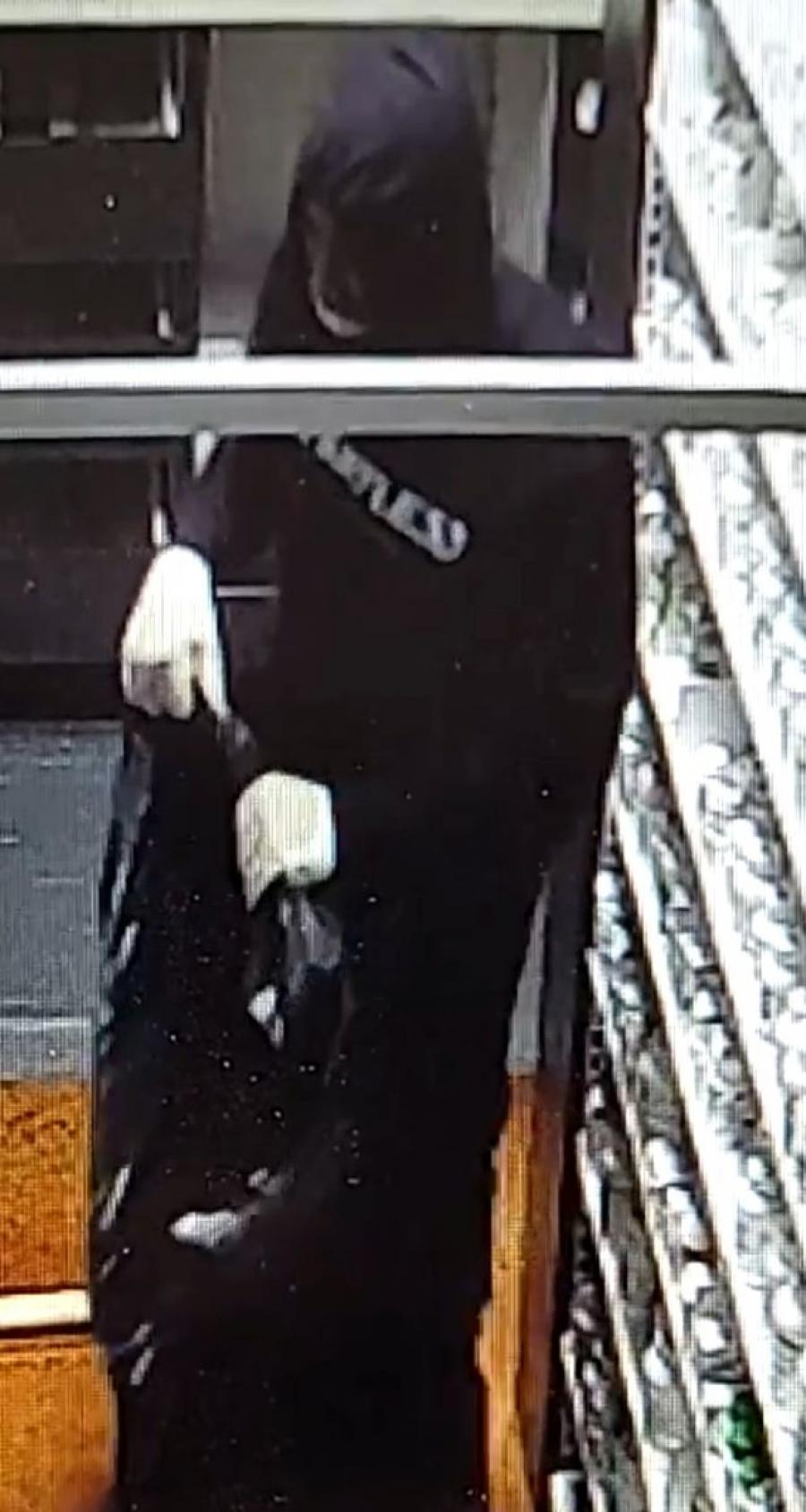 The suspect is described as a black male wearing white gloves and a dark-colored hoodie with the word “Heartless” on the front.