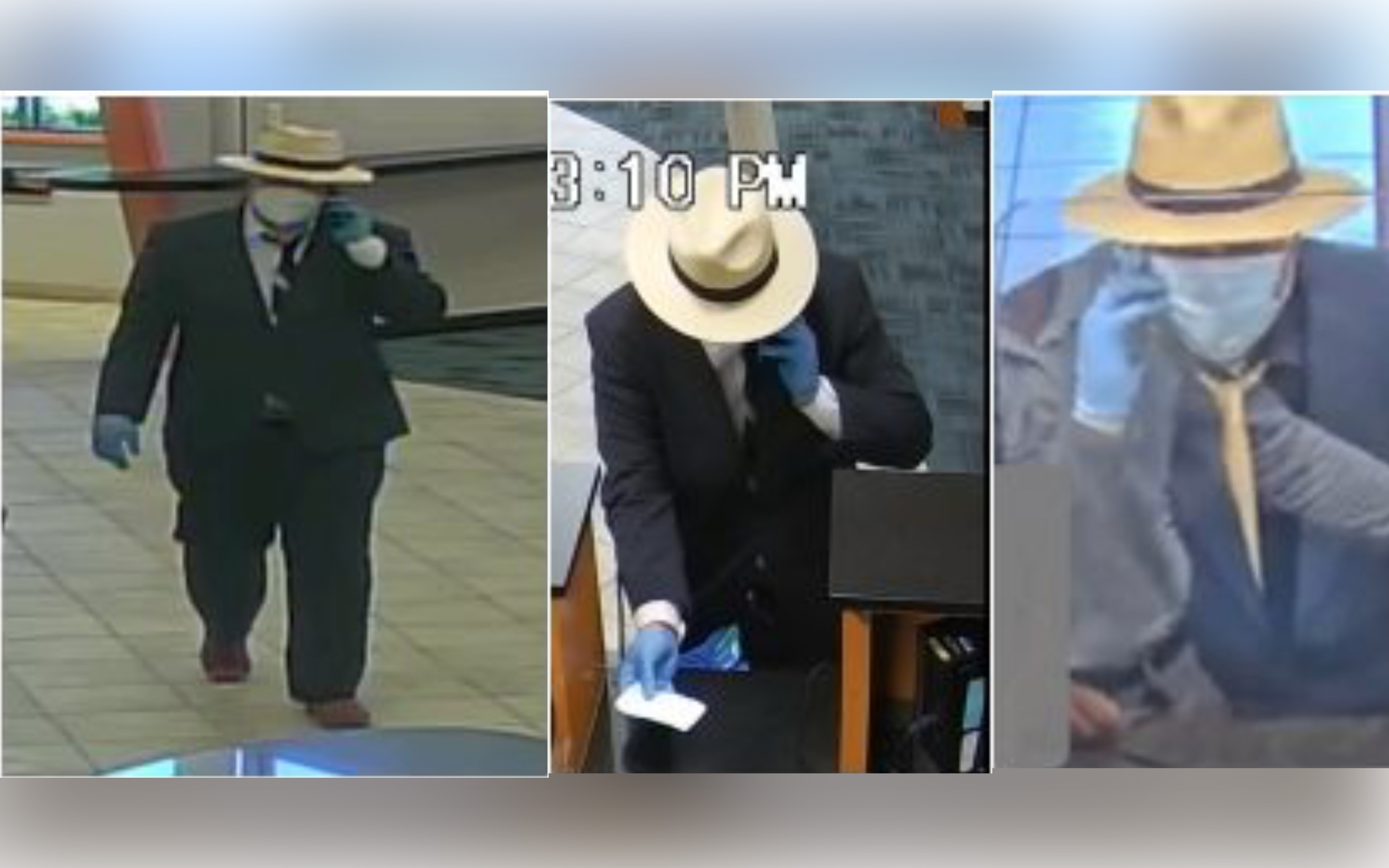The initial FBI investigation described the suspect as a well-dressed male, with light to medium complexion, green or hazel eyes, dark thick eyebrows, and a stocky build. During the Garland robbery, he wore a dark-colored suit, white shirt, dark tie with light-colored stripes, brown shoes, and a light fedora-style hat with a dark band. For the Dallas robbery, he wore a dark-colored suit, a dark shirt, and a light or yellow tie.