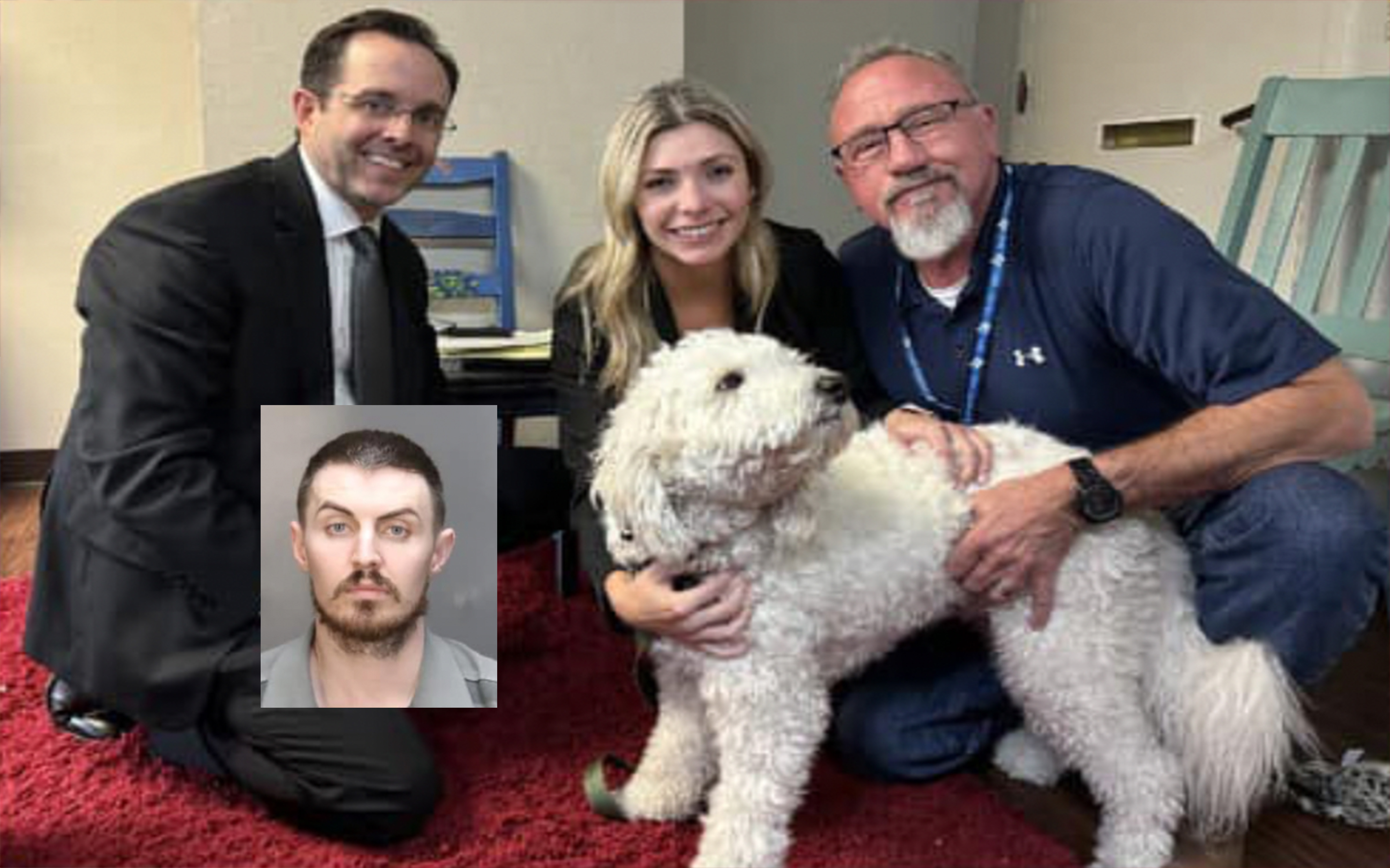 Prosecutors Ryan Calvert and Alyssa Killin, along with Investigator Keith Kitt, gather with Titan, the microchipped dog whose loyalty and presence helped police identify Mandy Reynolds’ killer. Inset: Derek Daigneault, convicted of Reynolds’ murder.