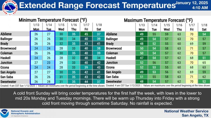 Highs will range from the low to mid-50s in San Angelo and surrounding areas to the mid-50s in southern locations, accompanied by north winds of 10 to 15 mph.