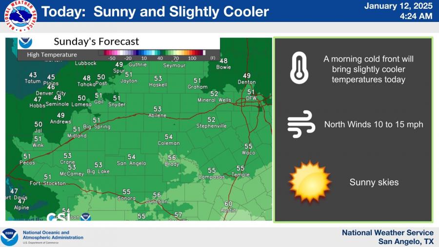 SAN ANGELO, TX — A weak cold front has moved into the region, bringing cooler temperatures and sunny skies to the Concho Valley today, according to the National Weather Service.