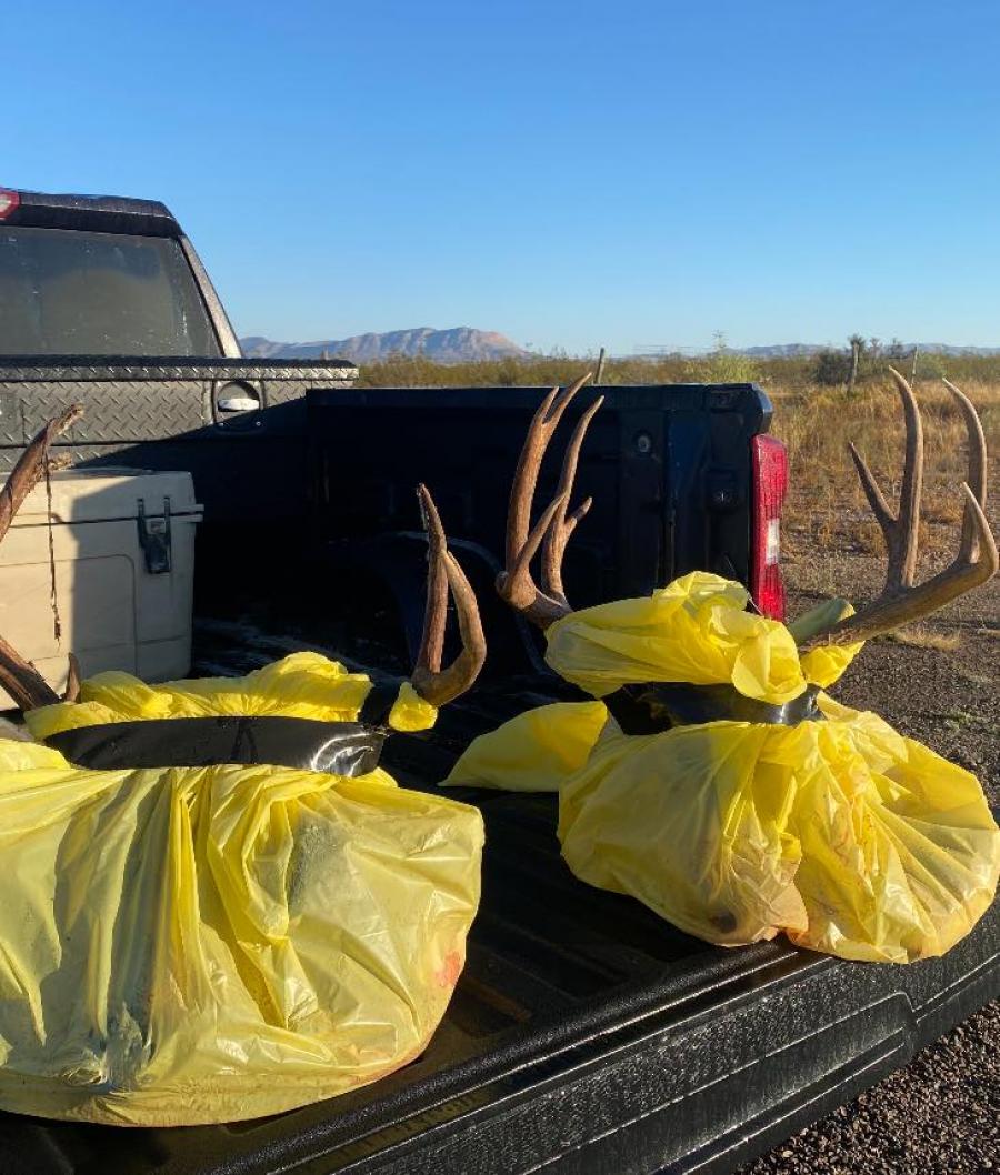 Crockett County and Brewster County Game Wardens responded the next day to interview the hunters, who admitted to shooting the bucks at last light when they saw antlers in the brush. They claimed they mistook the mule deer for white-tailed deer and took the shots as soon as the deer stood up. The wardens seized both bucks and issued citations for unlawful means and methods, warnings for taking mule deer out of season and the hunters were charged civil restitution for the two bucks.