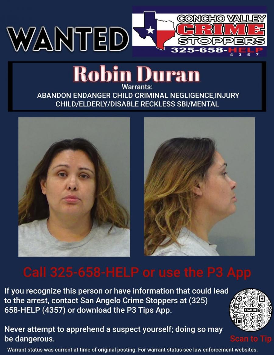 Robin Duran is wanted on warrants for abandoning or endangering a child through criminal negligence, as well as causing injury to a child, elderly person, or disabled individual through reckless behavior involving serious bodily injury or mental harm.