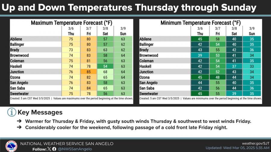 Temperatures are forecast to rise Thursday and Friday, with highs reaching the low 80s in some areas. However, a cold front will move through late Friday night into early Saturday, bringing cooler temperatures for the weekend. Highs will drop into the 50s and low 60s, while overnight lows could fall into the 30s.