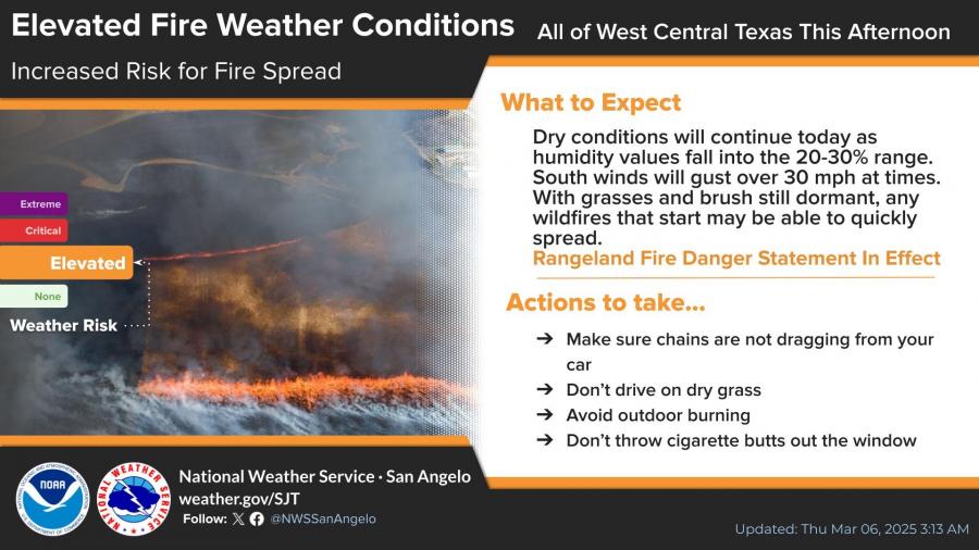 According to the National Weather Service in San Angelo, humidity values will drop to 20-30%, and wind gusts are expected to exceed 30 mph. With dormant grass and brush, any fires that ignite could spread rapidly. A Rangeland Fire Danger Statement is in effect.