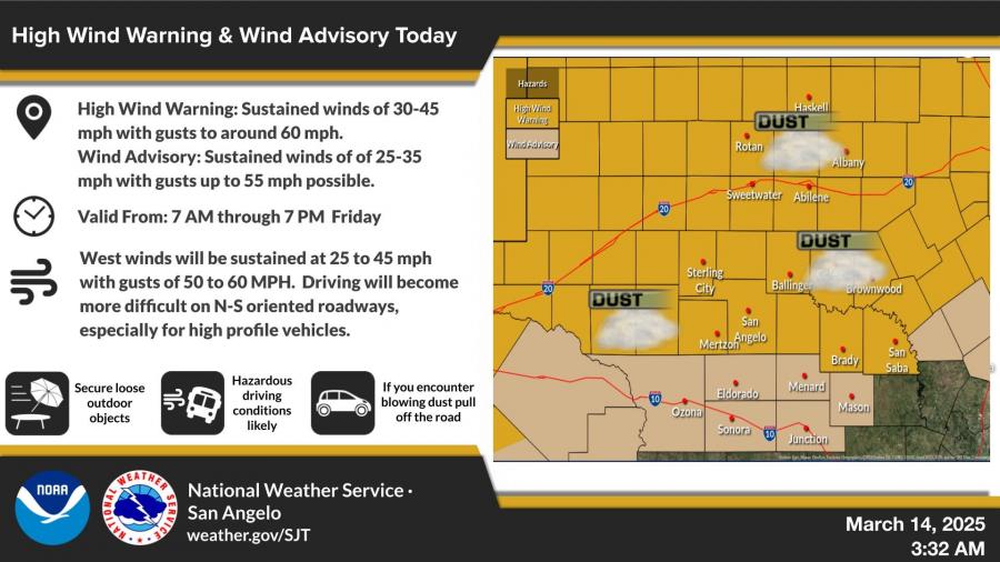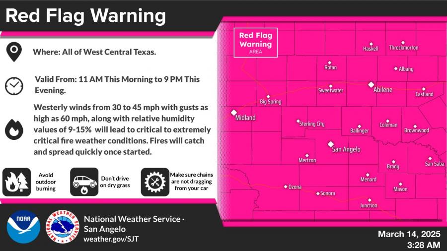 SAN ANGELO, TX – A Red Flag Warning and High Wind Warning are in effect across West Central Texas today, with strong westerly winds up to 60 mph and critically dry conditions expected to increase fire danger.