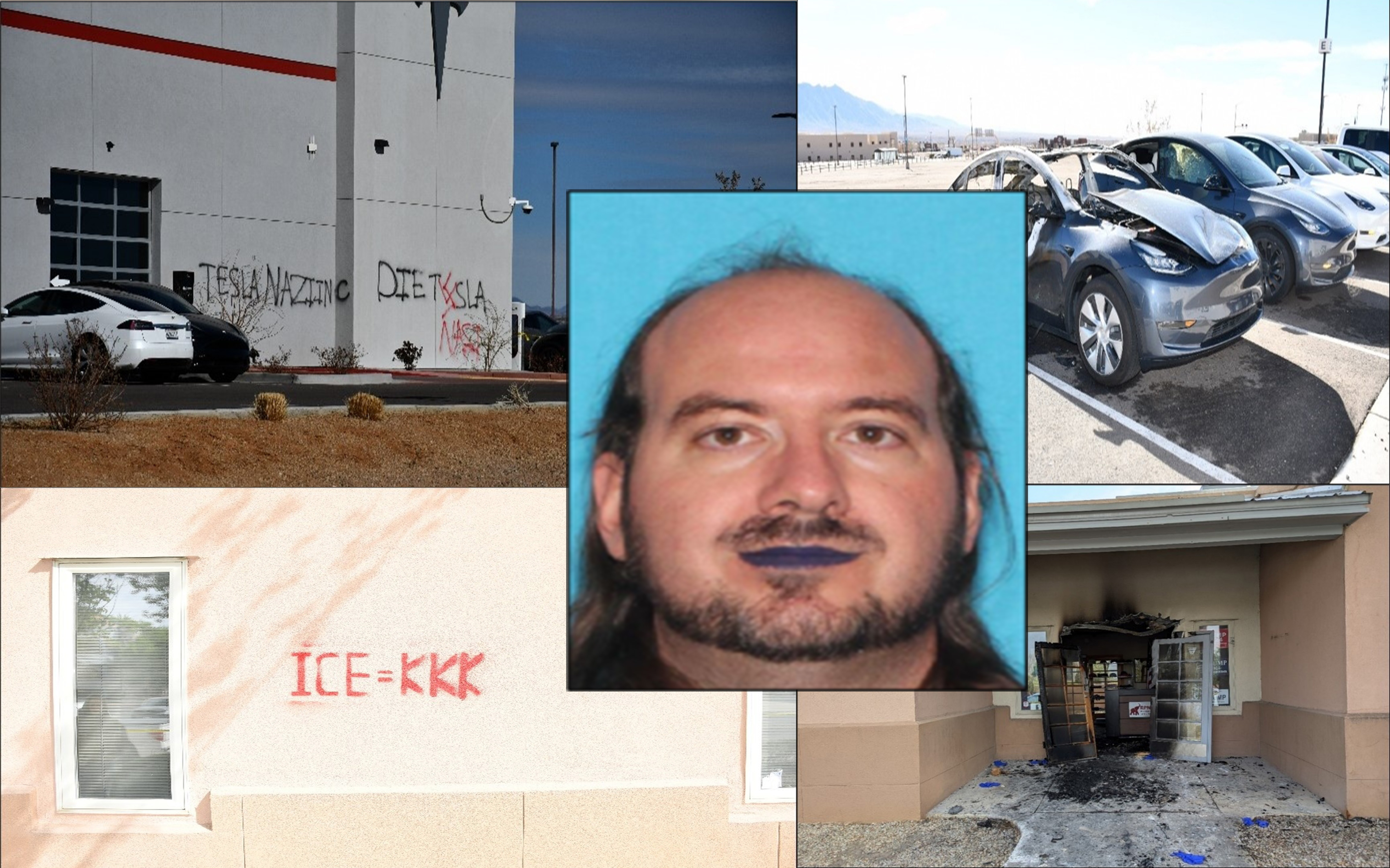 According to the U.S. Department of Justice, Wagner allegedly firebombed the Tesla Albuquerque Showroom on Feb. 9, setting two vehicles ablaze and defacing the building with swastikas and graffiti reading “Die Elon” and “Tesla Nazi Inc.” On March 30, he allegedly attacked the GOP state headquarters, damaging the front entrance and spray-painting the phrase “ICE = KKK” on the building.