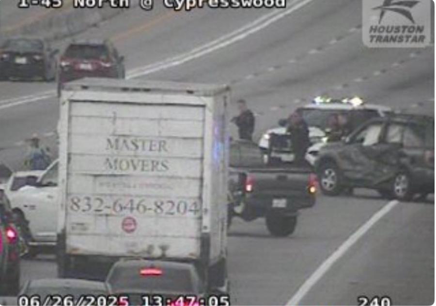 According to the Harris County Precinct 4 Constable’s Office, the incident began when a crash was reported on the southbound lanes of the North Freeway in the Spring area. Responding deputies were told by a 911 caller that one of the individuals involved was armed. Authorities said the woman had struck another vehicle before pulling over and refusing to comply with deputy commands.