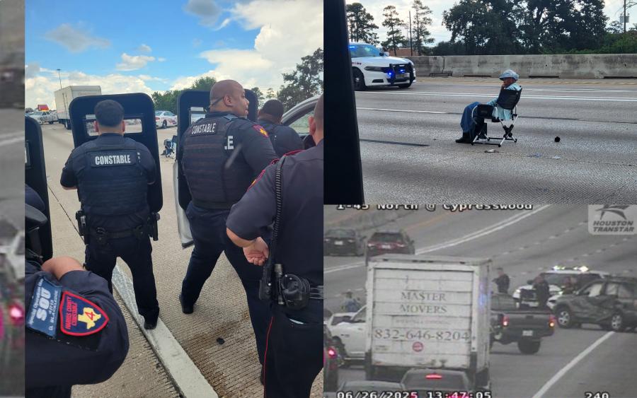 Pct. 4 officials said the woman exited her vehicle, sat in a lawn chair on the freeway, and held a gun to her head while ignoring law enforcement commands. A trained negotiator was brought in to speak with the woman, and authorities also contacted a family member to assist.