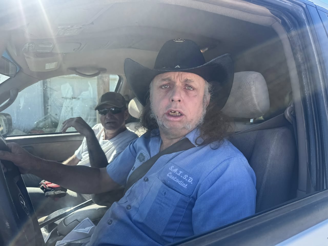 Photos released by the fire department show two men sitting inside a light-colored Toyota Sequoia.  Another photo shows the SUV’s rear with a temporary Texas license plate number 8168T89, military ribbon decals, and a bumper sticker reading “Proudly Served.”