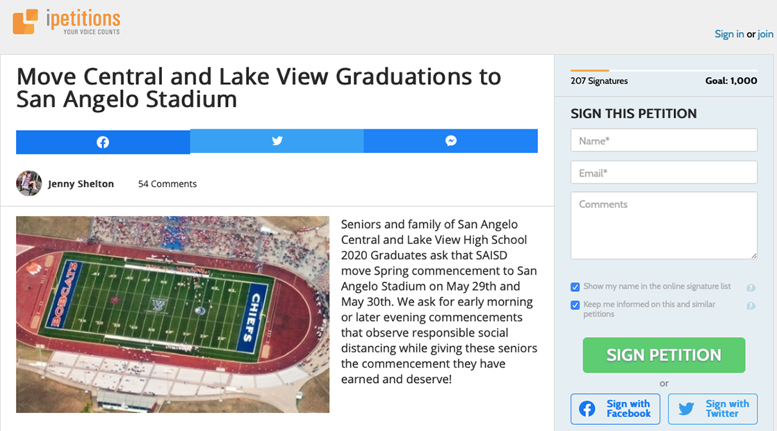 The petition has garnered 207 signatures to date and has a goal of 1,000. To sign the petition visit the following link on iPetitions Move Central and Lake View Graduations to San Angelo Stadium.