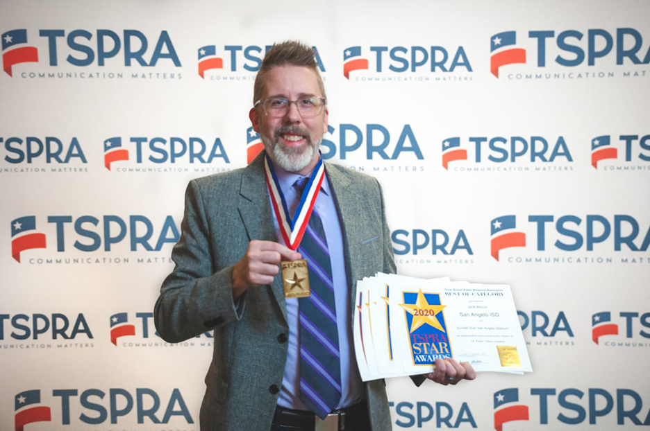 SAN ANGELO, TX – The San Angelo Independent School District announced Communications Specialist Jack Wilcox was honored with eleven state awards at the 2021 Texas School Public Relations Association (TSPRA) Conference.
