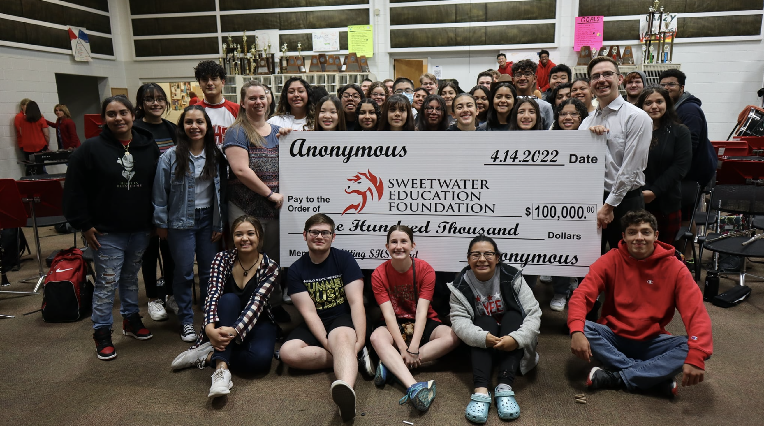 According to Sweetwater ISD, on Apr. 14, The Sweetwater Education Foundation presented the Sweetwater Mustang Band with a $100,000 anonymous donation this morning.