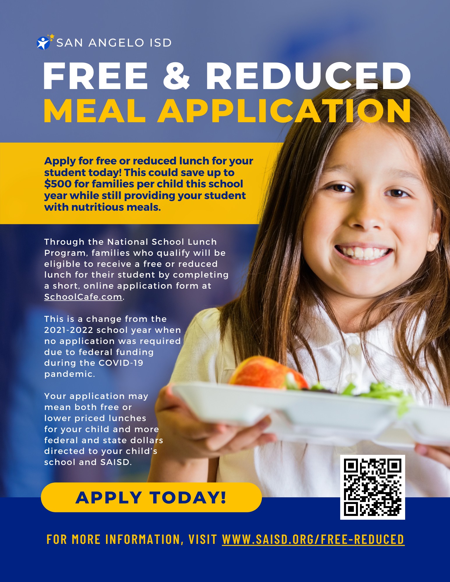 Complete the short, online application at SchoolCafe at www.schoolcafe.com/SanAngeloISD. Click here to learn https://www.saisd.org/.../san-angelo-isd-transitions-back... #MorethanaMeal