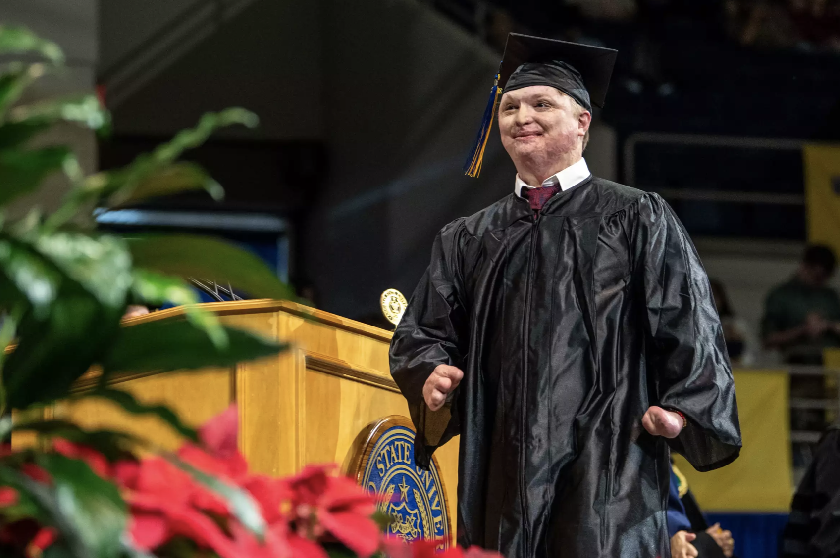 Against all odds, on Saturday, Dec. 10, Sutterfield crossed the stage at the Junell Center/Stephens Arena to receive his ASU Bachelor of Arts in English degree, with a large group of family, firefighters, nurses and doctors there to cheer him on.