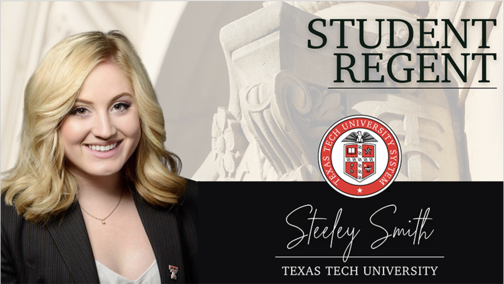 Per Greg Abbott’s office, “Governor Greg Abbott has appointed Steeley Smith as the student regent for the Texas Tech University System for a term set to expire on May 31, 2024.”